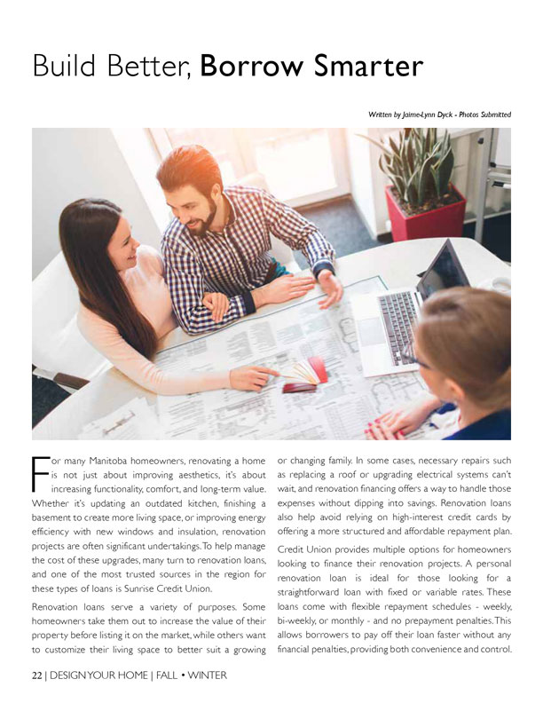 Credit Union provides multiple options for homeowners looking to finance their renovation projects. A personal renovation loan is ideal for those looking for a straightforward loan with fixed or variable rates. These loans come with flexible repayment schedules – weekly, bi-weekly, or monthly – and no prepayment penalties. This allows borrowers to pay off their loan faster without any financial penalties, providing both convenience and control. For homeowners who have built up equity in their homes, Sunrise also offers home equity lines of credit and home equity loans. These options generally come with lower interest rates and allow the borrower to access funds as needed, paying interest only on the amount borrowed.